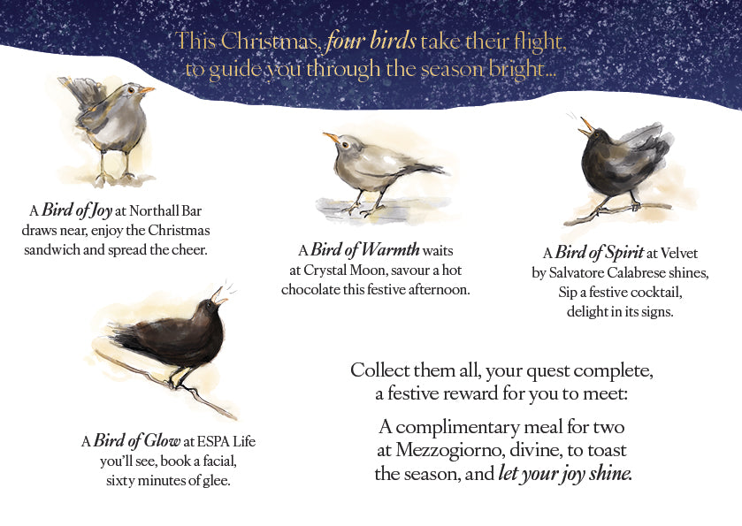Illustrations of 4 Calling Birds to be used on collectable cards in conjunction with events and guest experiences at the hotel.