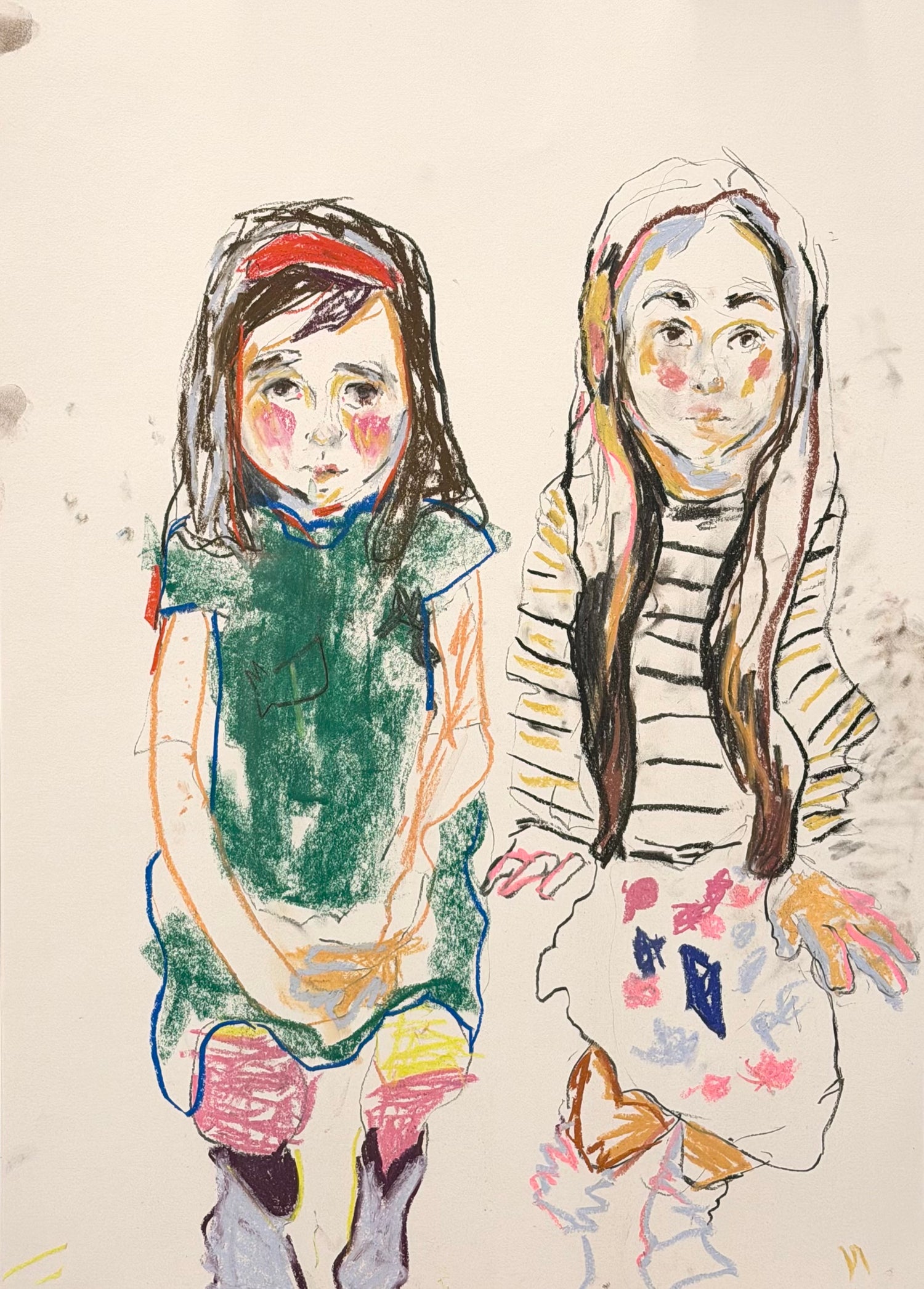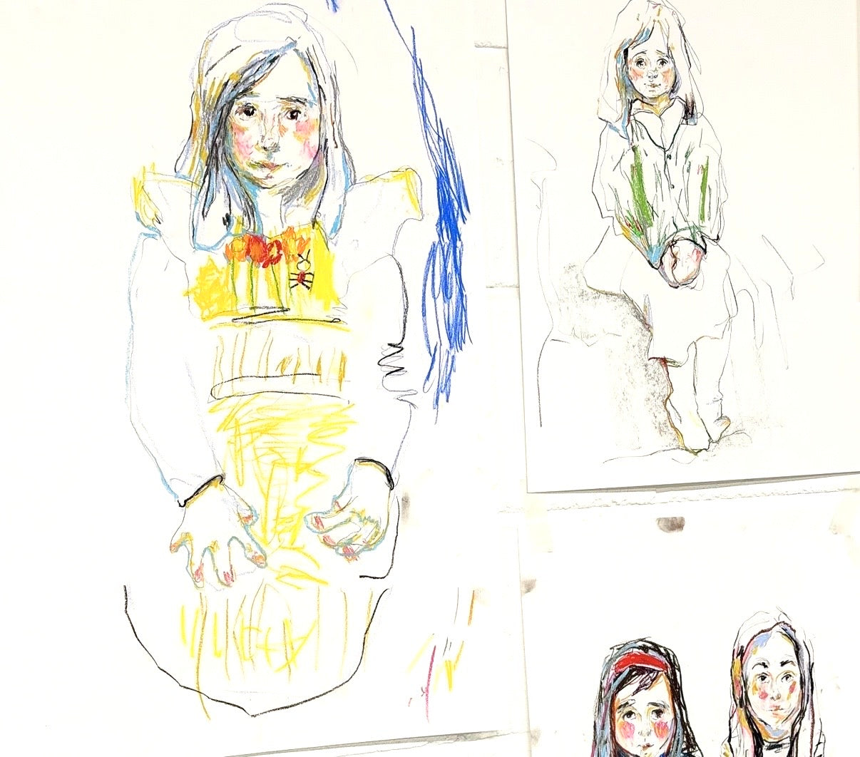 Working from life in a very short sitting (often 5-10mins), capturing likeness and character of a child in charcoal. Then inviting the child to complete the drawing alongside me, adding colour, texture, encouraging their creative expression. The desired result is the sweet spot where adult self conscious mark making meets with a childs unboundless creativity, often with unique and exciting results.